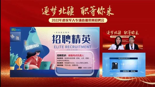 12月10日,由自治区退役军人事务厅主办、全区各盟市退役军人事务局协办的“逐梦北疆 职等你来”2022年退役军人专场直播带岗招聘会正式启动,为全区有求职意愿的自主就业退役士兵、自主择业军转干部、复员干部以及随军家属提供约1000个优质岗位。