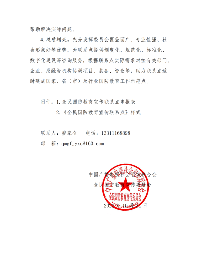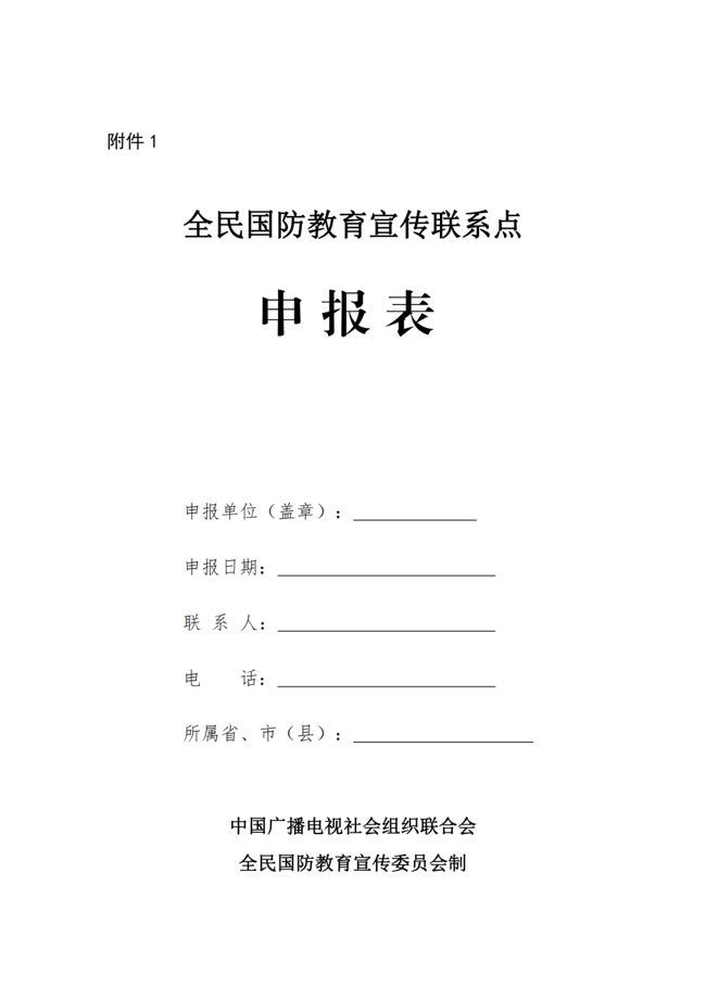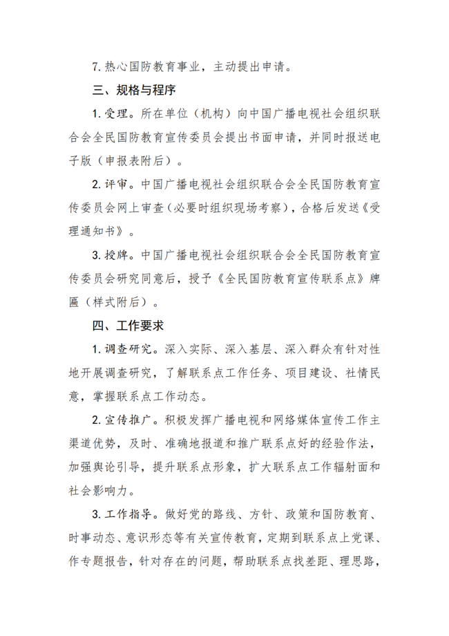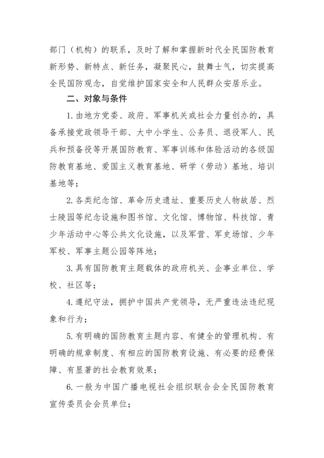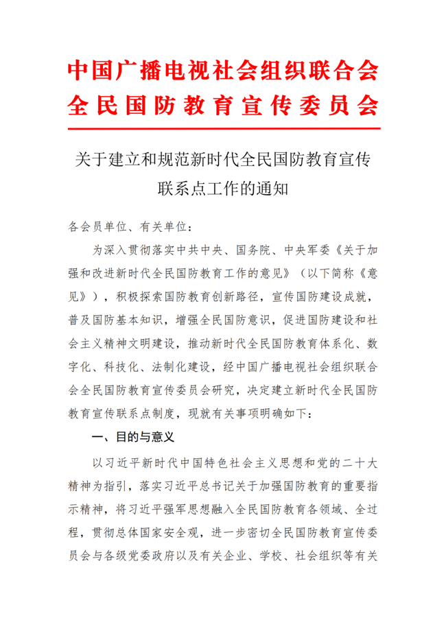 为深入贯彻落实中共中央、国务院、中央军委《关于加强和改进新时代全民国防教育工作的意见》,积极探索国防教育创新路径,宣传国防建设成就,普及国防基本知识,增强全民国防意识,促进国防建设和社会主义精神文明建设,推动新时代全民国防教育体系化、数字化、科技化、法制化建设,中国广播电视社会组织联合会全民国防教育宣传委员会决定建立新时代全民国防教育宣传联系点制度。联系点申报单位主要面向各级国防教育基地、爱国主义教育基地、研学(劳动)基地、培训基地等;各类纪念馆、革命历史遗址、重要历史人物故居、烈士陵园等纪念设施和图书馆、文化馆、博物馆、科技馆、青少年活动中心等公共文化设施,以及军营、军史场馆、少年军校、军事主题公园等阵地;还包括具有国防教育主题载体的政府机关、企事业单位、学校、社区等。