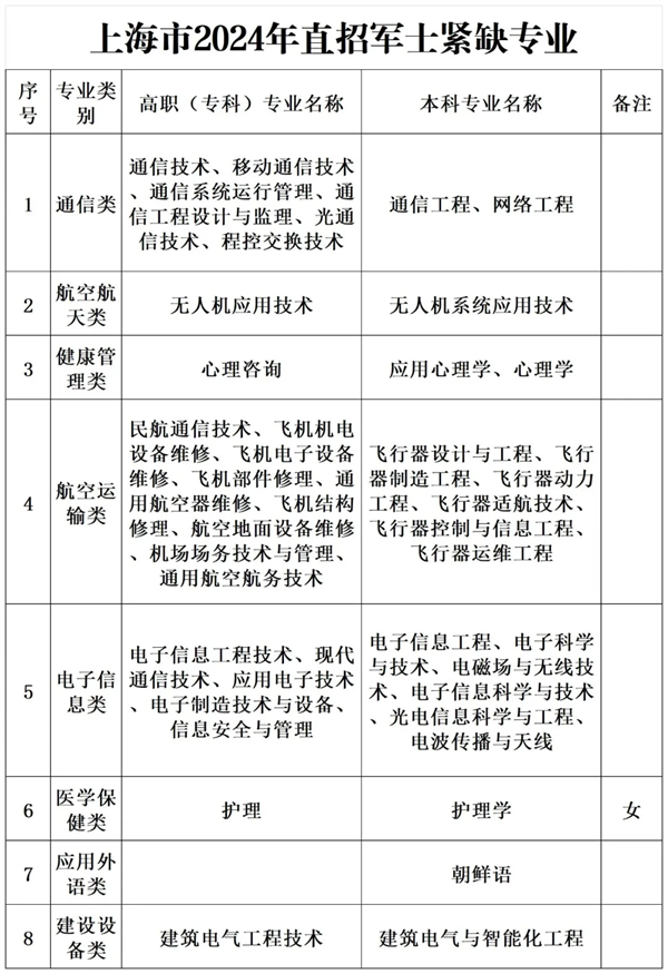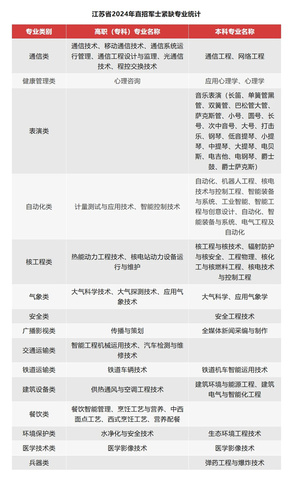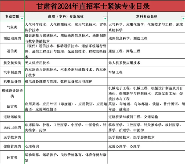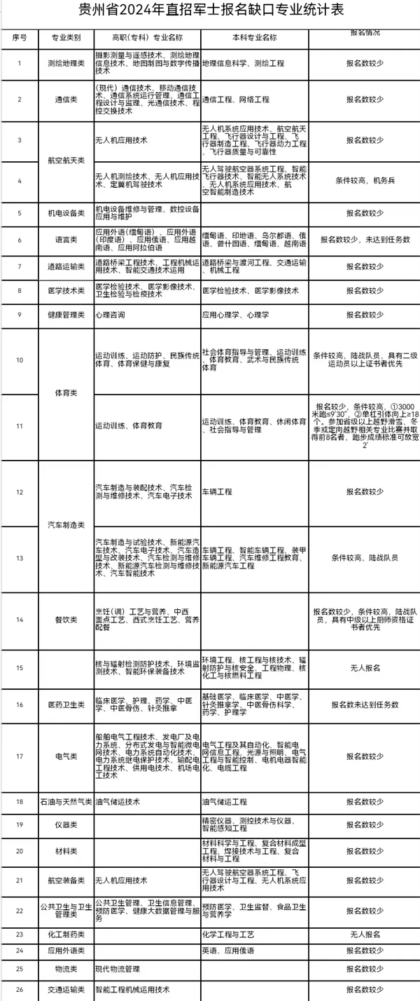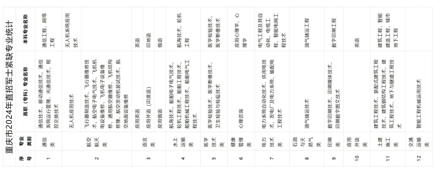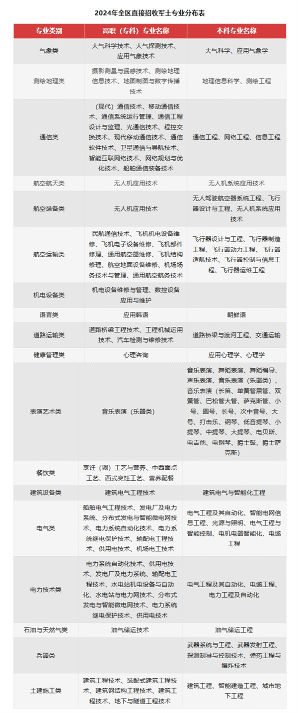 经初步统计,2024年直招军士涉及道路运输、汽车制造、电子信息、通信、计算机、机电设备、机械、医药等400余个军民通用专业。