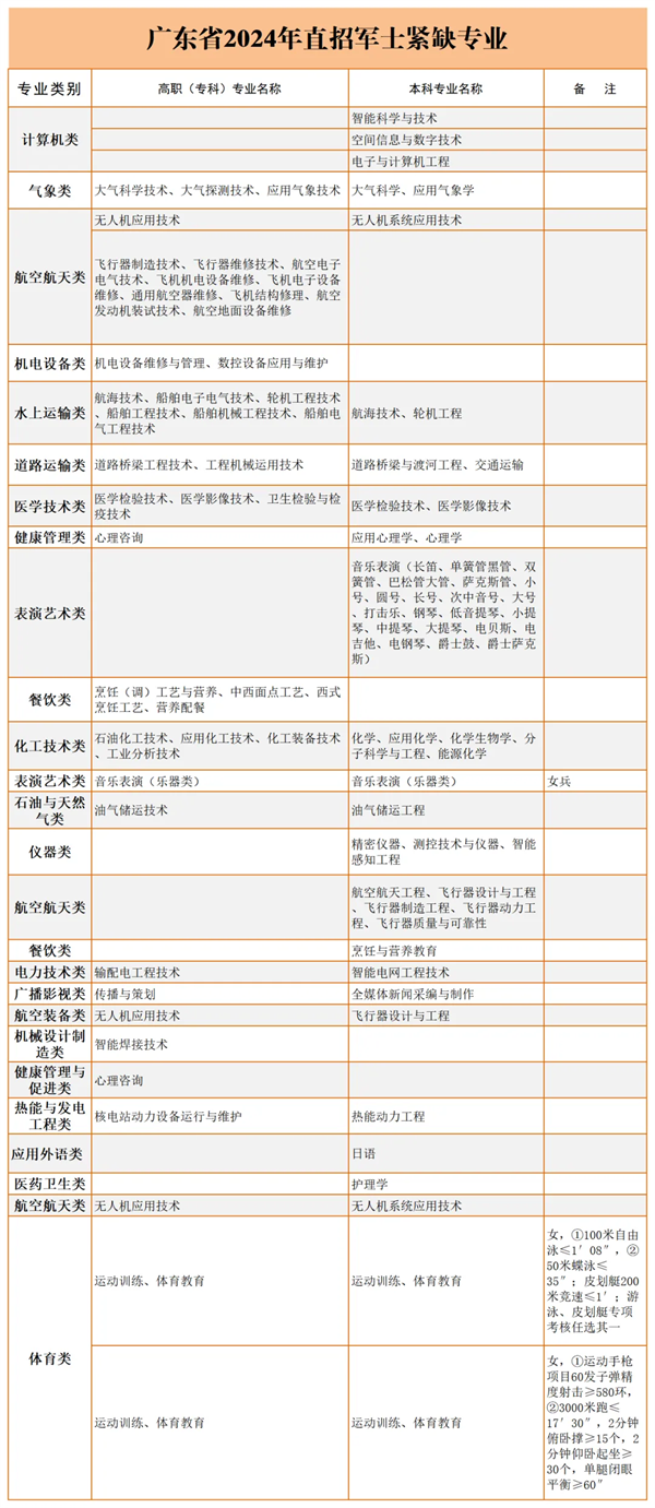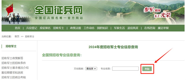 6至7月份,国防部征兵办公室根据部队招收需求,结合网上预报名情况,下达各省(自治区、直辖市)招收任务。应征青年可查询所学专业是否符合2024年省级招收军士专业范围。(招收专业查询)