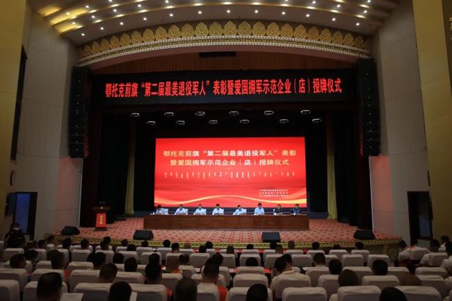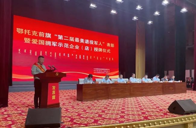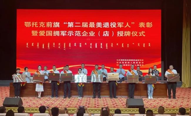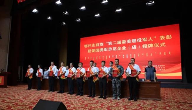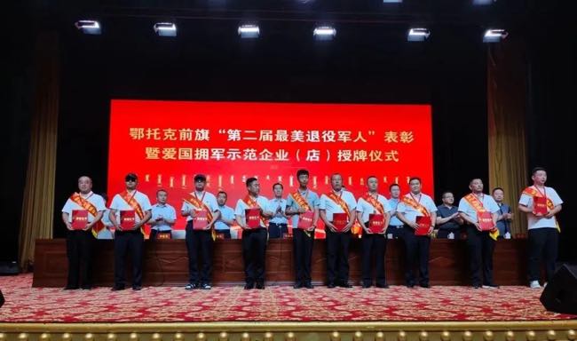 6月14日,鄂托克前旗举行第二届“最美退役军人”表彰暨爱国拥军示范企业(店)授牌仪式,对10名获“最美退役军人”荣誉称号,10名获“模范兵支书”的退役军人进行表彰,并为爱国拥军示范企业(店)代表授牌,进一步弘扬全旗退役军人“喜迎二十大 再创新辉煌”的奋斗精神,营造出拥军优属浓厚氛围,为开创军民融合深度发展新局面提供强大精神动力。