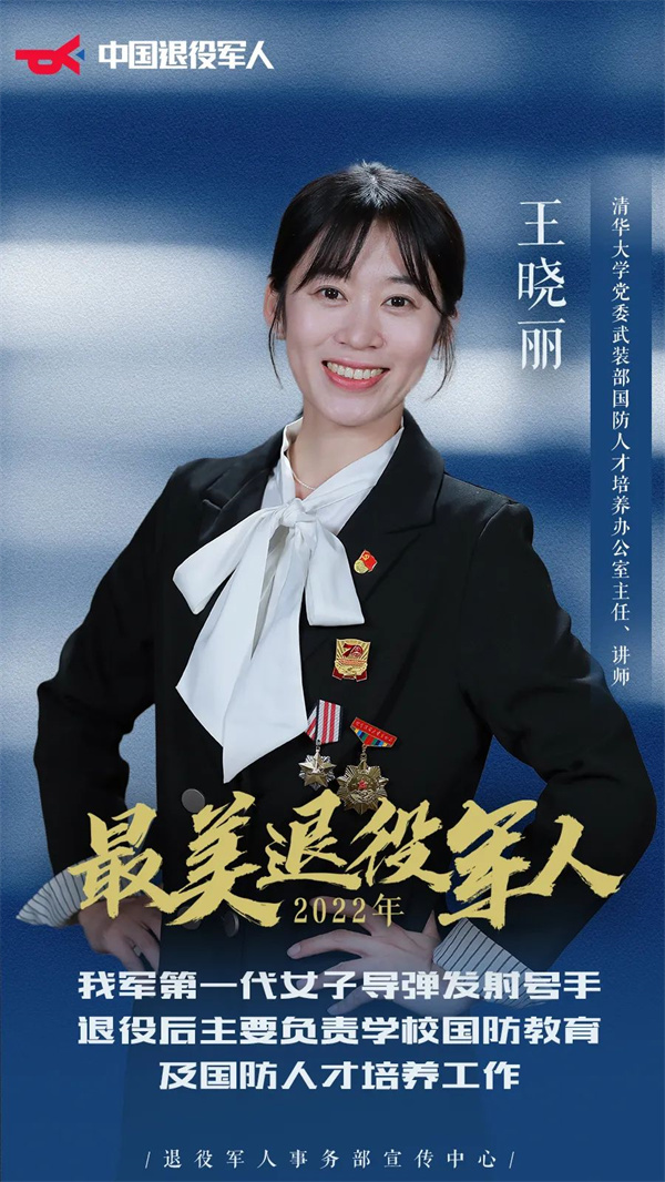 王晓丽 女,汉族,中共党员,1988年出生,2009年入伍,2011年退役,清华大学党委武装部国防人才培养办公室主任、讲师。