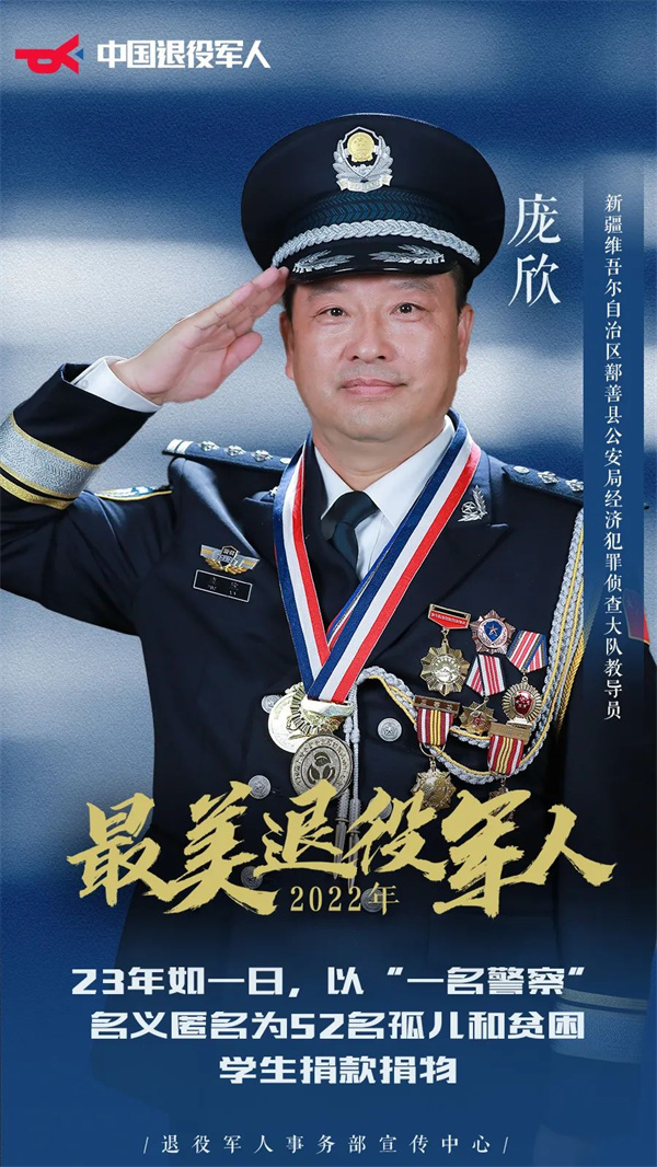 庞欣从1997年开始坚持照料8个汉族、维吾尔族、回族困难老人家庭,照顾老人们生活起居,并为其中3位老人送终。他23年如一日,以“一名警察”名义匿名为52名孤儿和贫困学生捐款捐物,帮助他们实现读书梦。自2015年以来,他连续7年将评先评优获得的奖金和年底奖励工资,作为特殊党费上缴党组织,用于帮助困难党员。他曾因公负伤需常年吃药,家庭负担较重,却坚持从收入中拿出近40万元赡养“父母”、抚养“儿女”,资助需要帮助的人。2022年被评为第七届新疆维吾尔自治区道德模范。