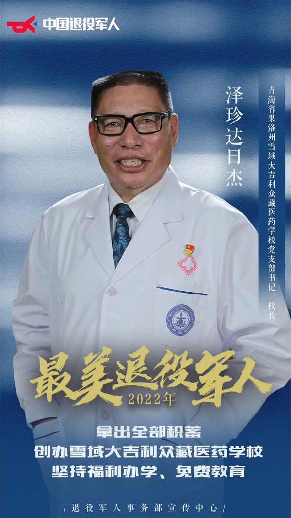 从医40多年来,泽珍达日杰赡养孤寡老人数十名,为经济困难患者减免医疗费10万余元,垫付医药费5万余元。他感念部队培养,投身公益事业,拿出全部积蓄创办雪域大吉利众藏医药学校,并按照公益性原则,坚持福利办学、免费教育,靠夫妻二人退休工资和诊所收入维持学校日常开支。办学20年,他帮助上千名贫困学生完成学业,带动数百个贫困家庭摆脱贫困,逐步迈向小康,为解决藏区特别是农牧区缺医少药困难,促进藏区基层医疗卫生事业发展作出积极贡献。2017年获评全国少数民族医药工作表现突出个人,2021年荣获青海省优秀共产党员。