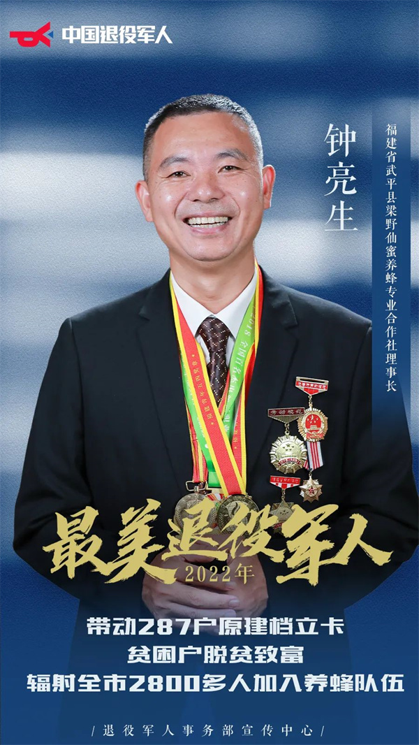 钟亮生退役后自主创业,从一名普通退役士兵成长为当地有名的“蜂王”,先后筹建养蜂专业合作社、蜂业公司、养蜂协会,通过“合作社+公司+基地+农户”模式,在“甜蜜事业”上闯出一片天地。他扶贫济困、奉献爱心,帮助全县192名残疾人就业创业,创新激励扶贫机制模式,带动287户原建档立卡贫困户脱贫致富,辐射全市2800多人加入养蜂队伍。经营的蜂蜜品牌获得省著名商标,推动蜂蜜产业成为武平农业支柱产业之一。2015年荣获“福建青年五四奖章”,2018年荣获福建省劳动模范。