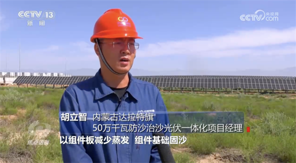 内蒙古达拉特旗50万千瓦防沙治沙光伏一体化项目经理 胡立智:以组件板减少蒸发,组件基础固沙,板下生态种植,作物围沙固沙。形成了光伏+生态修复,生态治理新模式。