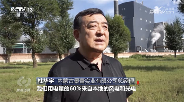 内蒙古景蕾实业有限公司总经理 杜华宇:60%的用电量来自本地的风电和光电,按目前的生产规模,一年能省6万吨煤炭,减少16万吨二氧化碳排放。