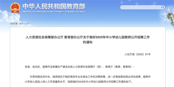 为贯彻落实党中央、国务院关于做好高校毕业生就业工作的决策部署,进一步落细落实就业优先政策,提高中小学幼儿园选人用人工作质量和水平,现就做好2025年中小学幼儿园教师公开招聘工作通知如下。