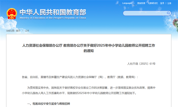 为贯彻落实党中央、国务院关于做好高校毕业生就业工作的决策部署,进一步落细落实就业优先政策,提高中小学幼儿园选人用人工作质量和水平,现就做好2025年中小学幼儿园教师公开招聘工作通知如下。