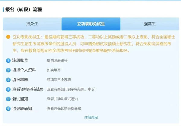 符合免初试资格的考生,应在教育部规定的全国统考报名时间内登录“全国推荐免试攻读研究生(免初试、转段)信息公开暨管理服务系统”(网址:https://yz.chsi.com.cn/tm)报名,逾期不得补报。