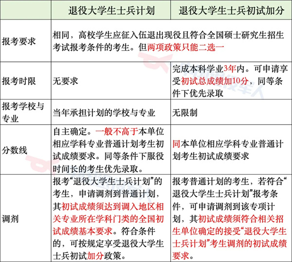 报考普通计划的考生,若报名时申请退役大学生士兵初试加分并审核通过,调剂阶段可按规定申请调剂“退役大学生士兵计划”;若报名时未申请退役大学生士兵初试加分的,不可参加“退役大学生士兵计划”调剂。