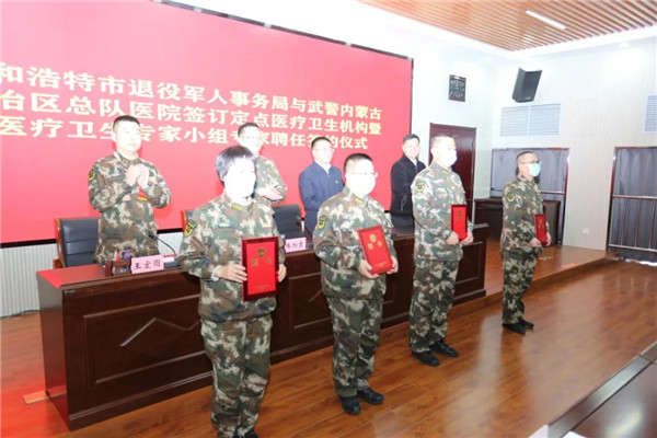 2022年1月30日上午,呼和浩特市退役军人事务局与武警内蒙古自治区总队医院签订了定点医疗卫生机构委托协议,同时为医疗卫生专家小组成员颁发了聘书。呼和浩特市退役军人事务局党组书记、局长张普、副局长白奋兵及武警内蒙古自治区总队医院领导、医疗卫生专家参加签约仪式。