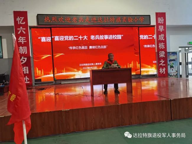 为弘扬中华民族革命传统,传承红色基因,强化青少年的爱国主义教育。9月21日下午,达拉特旗退役军人事务局开展“喜迎党的二十大 老兵故事进校园”活动,老兵宣讲走进达拉特旗实验小学。