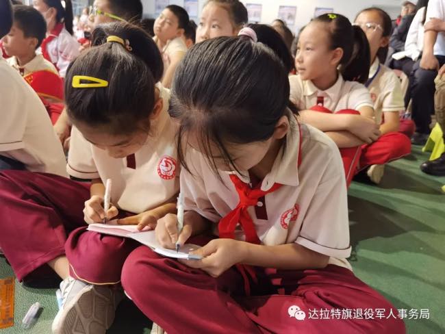 在旗实验小学举办的“老兵故事进校园”活动,其主要目的是以“老兵”身份,从“老兵”视角,用“老兵”语言,讲述“老兵”故事,为同学们系好人生第一粒扣子,厚植爱国情怀。活动最后,学生们和老兵畅谈,“您对我们的寄语是什么?”“您印象深刻的战友是谁?”看见孩子们在笔记本上写下了“为中华崛起而读书,要珍惜现在的幸福生活。”