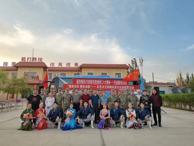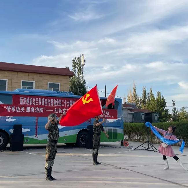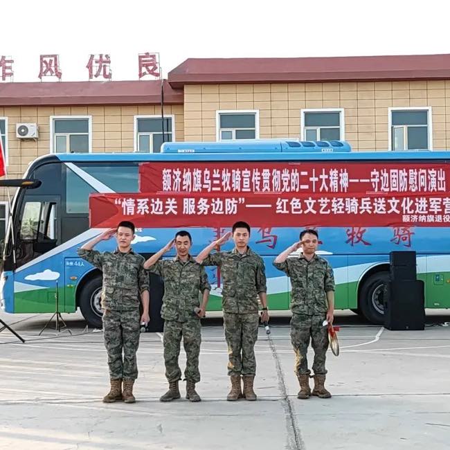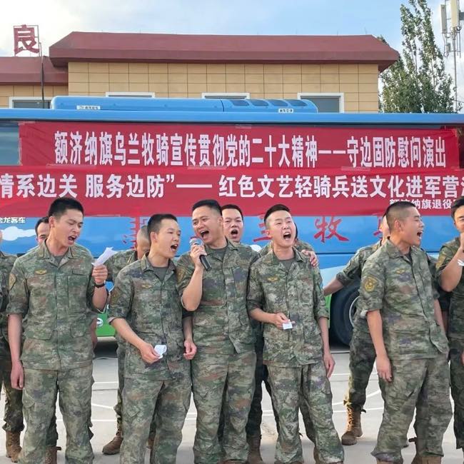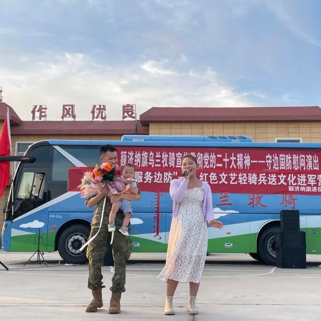 旗乌兰牧骑为部队官兵献上了一场精彩纷呈的慰问演出。演出开场前,额济纳旗退役军人事务局党组书记、局长吕金泉为官兵们赠送了涵盖退役军人政策类、文学类、军事类的图书集。随后旗乌兰牧骑“红色文艺轻骑兵”为官兵们上演了《哈达献给解放军》《骏马归来》等精彩节目,边防官兵们也带来了精彩合唱《兄弟干一杯》,唱出了战士们之间深厚的战友情,更有军嫂倾情献唱《喜欢你》,表达了家属对战士们工作的支持。整场演出精彩纷呈、气氛热烈,此次慰问演出不仅让战士们放松了紧张训练的身心,也为今后的练兵备战、保家卫国注入了新的动力。