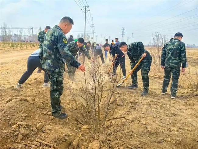 植树现场,干部职工分工协作、密切配合,各个环节衔接有序,挥锹铲土、培土围堰、提水浇灌、扶树正苗,合力栽下一株株树苗,圆满完成植树任务,经过大家的共同努力,一棵棵新植树苗迎风挺立,充满勃勃生机。