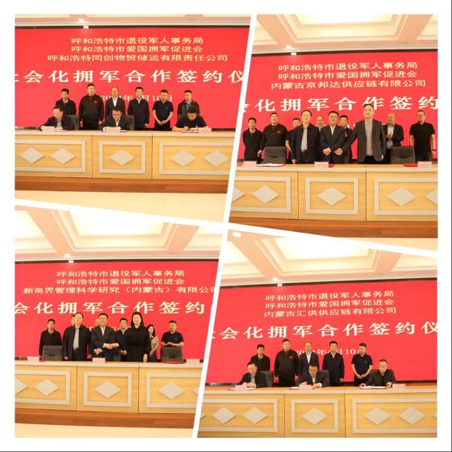 仪式上,市退役军人事务局、呼和浩特市爱国拥军促进会与内蒙古京邦达供应链科技有限公司、新商界管理科学研究(内蒙古)有限公司、呼和浩特同创物贸储运有限责任公司、内蒙古汇供供应链有限公司现场签约。