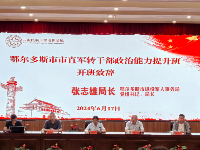 6月17日-21日,鄂尔多斯市市直军转干部政治能力提升班在云南民族干部培训基地举办。鄂尔多斯市退役军人事务局党组书记、局长张志雄出席开班仪式并讲话。市直40余名军转干部参加培训。本次培训班旨在以铸牢中华民族共同体意识为主线,聚焦提升军转干部政治能力,为鄂尔多斯市建设一支重实干、谋实事、出实招、务实绩、求实效的干部队伍。