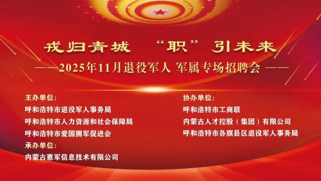 为深入做好退役军人、军属的就业服务,根据呼和浩特市退役军人事务局安排,拟在呼和浩特市社会化拥军服务示范园的退役军人就业创业服务中心,举办2025年第12场“戎归青城‘职’引未来”——退役军人、军属专场招聘会。