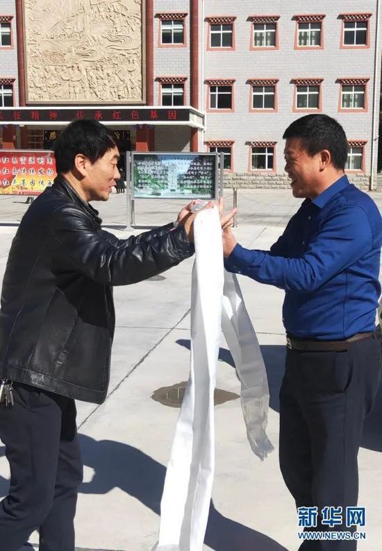 腊子口战役纪念馆工作人员向于都县革命烈士纪念馆馆长黄发斌(右)等人献上哈达(资料照片)。新华社发(于都县革命烈士纪念馆供图)