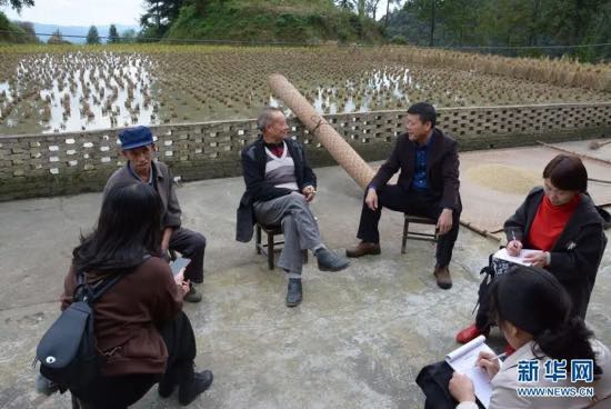 于都县革命烈士纪念馆馆员在贵州省黄平县采访于都籍失散红军钟兴明(又名钟元享)的女婿张礼平(左三)(资料照片)。新华社发(于都县革命烈士纪念馆供图)