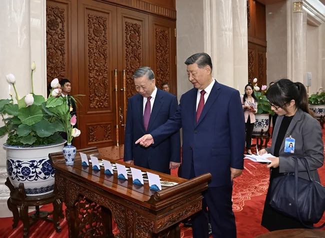 习近平再次祝贺苏林当选越共中央总书记。习近平指出,你就任总书记后首访就来到中国,充分体现了对两党两国关系的高度重视,也体现了中越关系的高水平和战略性。共同的理想信念是中越两党代代传承的红色基因,凝结成“越中情谊深、同志加兄弟”的传统友谊。作为当今世界两个执政的共产党,中越两党要秉持友好初心,赓续传统友谊,牢记共同使命,坚持共产党领导和社会主义制度,持续深化具有战略意义的中越命运共同体建设,共同促进世界社会主义事业发展。我愿同苏林同志建立良好工作关系和个人友谊,共同引领中越命运共同体建设走深走实。