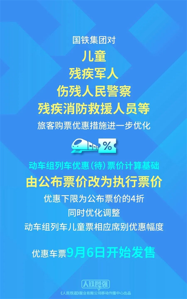 儿童、残疾军人、伤残人民警察、残疾消防救援人员等旅客购买普速旅客列车优惠(待)票的适用范围、计价规则保持不变。