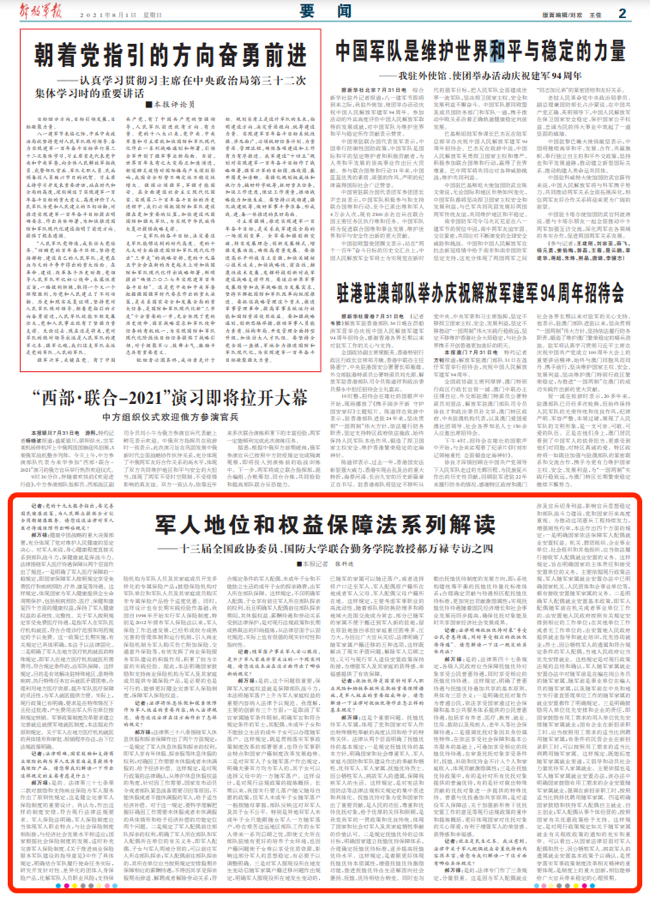 郝万禄:是的,这个问题很重要,保障军人家庭权益就是保障部队战斗力,本法将随军落户上升为军人家庭权益的重要内容纳入法律予以规范。我理解,主要的创新有三个方面:一是取消了军官家属随军条件限制,明确军官和符合规定条件的军士,其配偶、未成年子女和不能独立生活的成年子女可以办理随军落户。这样规定,既是贯彻落实军事政策制度改革的部署要求,也符合军事职业特点和国家户籍制度改革发展趋势。二是对双军人子女随军落户作出规定,明确夫妻双方均为军人的,其子女可以选择父母中的一方随军落户。这样设计,是对现行法规政策的提炼概括。长期以来,我国实行婴儿落户随父随母自愿的政策,但军人未成年子女随军落户一般按随母掌握,部队反映这对双军人及其子女不公平。特别是异地双军人未成年子女只能跟随女军人一方随军落户,给在艰苦边远地区部队工作的女军人带来一系列后顾之忧,即使丈夫所在部队驻地有更好的培养子女环境,也因户籍问题使子女难以享受优质资源,影响这部分军人的思想稳定,有必要予以调整明确。三是对军人服现役所在地发生变动后随军家属户籍迁移问题作出规定,明确军人服现役所在地发生变动的,已随军的家属可以随迁落户,或者选择将户口迁至军人、军人配偶原户籍所在地或者军人父母、军人配偶父母户籍所在地。这样规定,主要考虑军事职业的高流动性,随着部队移防换防增多和跨地域大范围交流成为常态,部分已随军的家属不便于搬迁到军人新的驻地,留在原驻地独自承担家庭重任困难多、压力大,为回应广大官兵关切,法律明确了随军家属户籍迁移的五种选项,这样既解决了现实矛盾问题,解除军人后顾之忧,又可与现行军人退役安置政策保持衔接,为增强军人及其家庭的获得感、幸福感提供了有效保障。